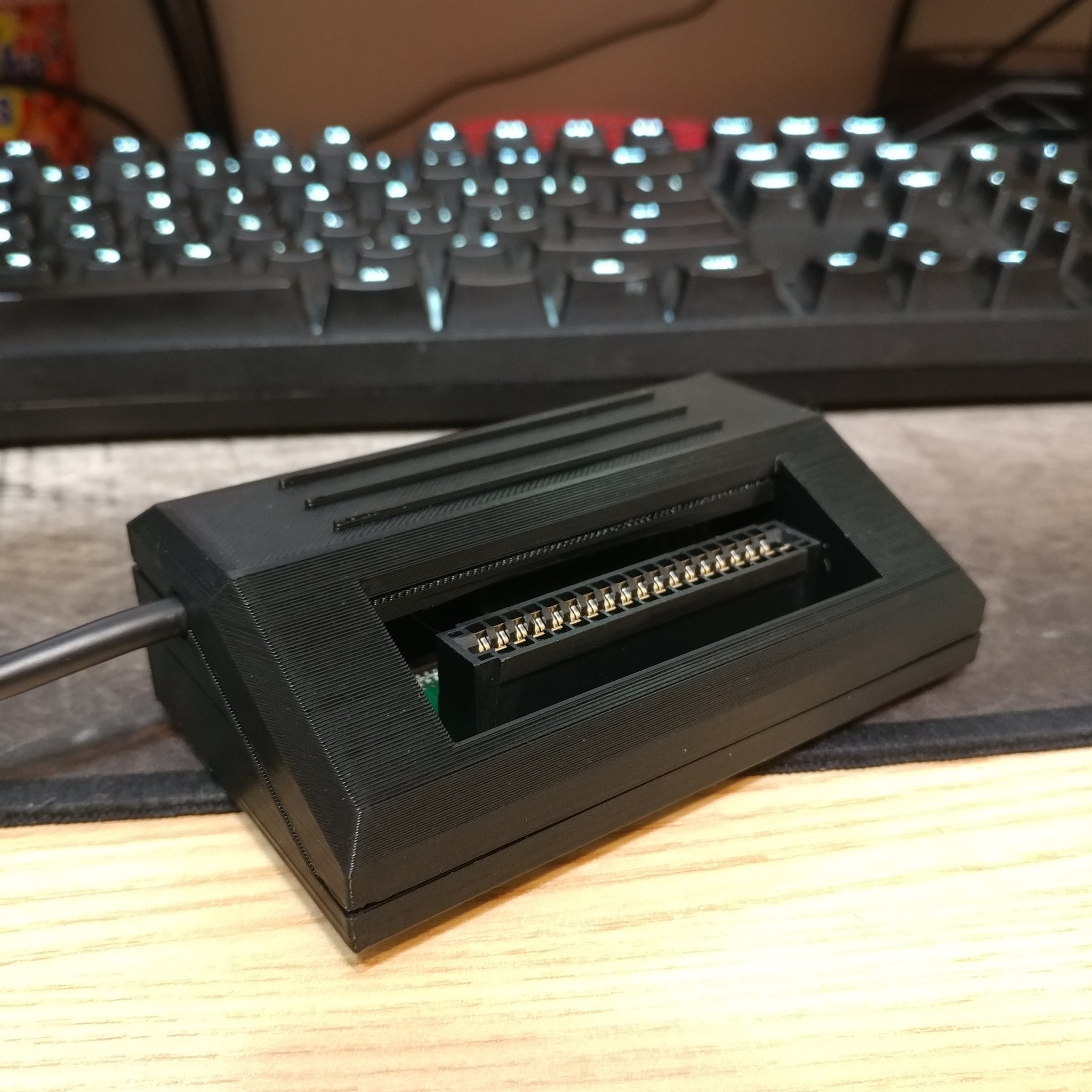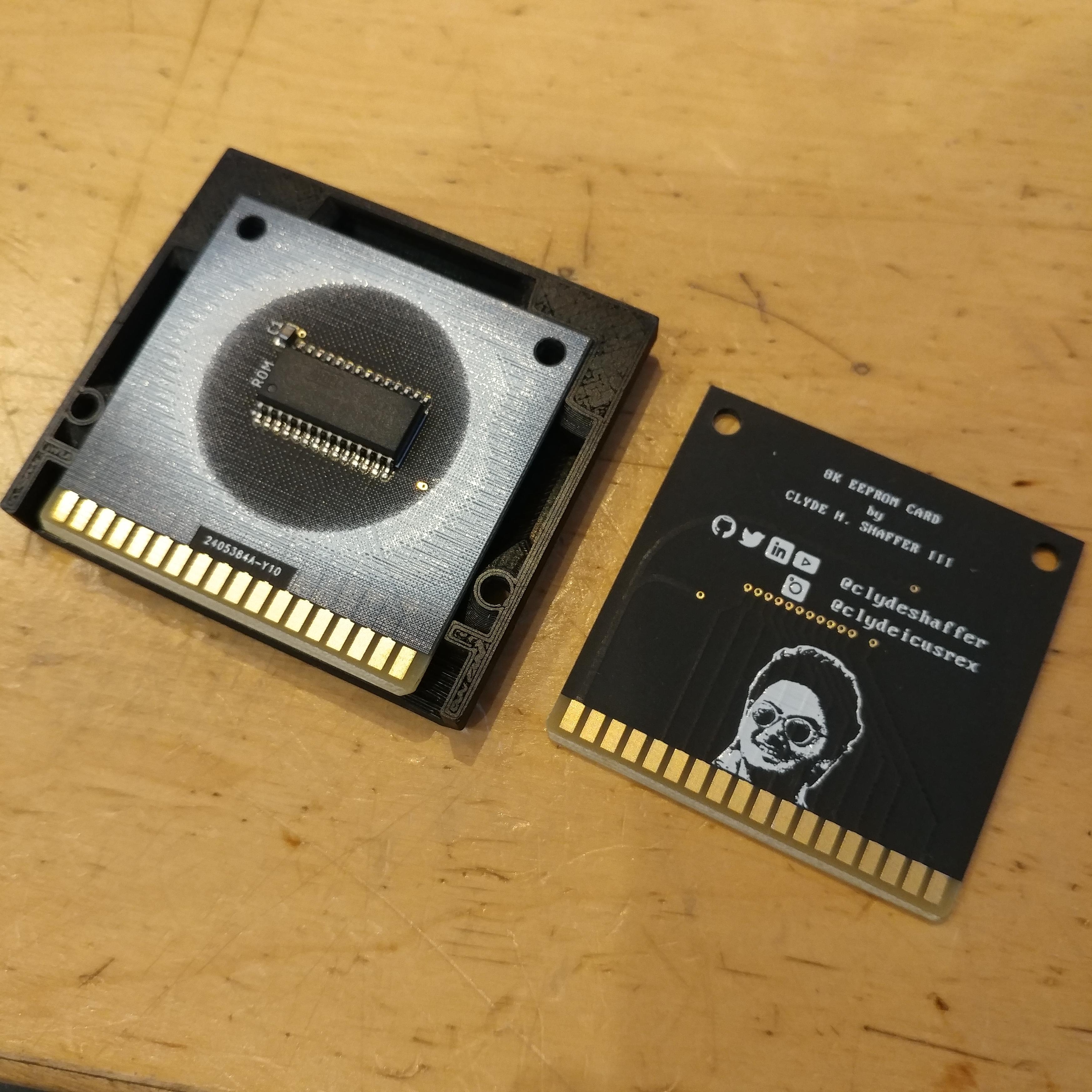 If some of the address numbering looks like it's all over the place, it's because I was somewhat adopting the positioning from the pins on the ROM chip I'm using, the AT28C64. I don't actually know why it's like that. I designed PCBs for using this pinout and that particular ROM chip, along with 3D printed cases. To program it, I built an Arduino-based cartridge programmer that would connect to my PC over USB and load data using a specially made command line utility.