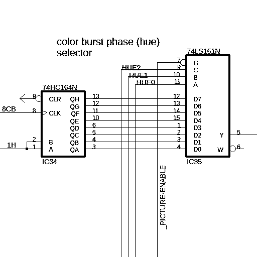 Ultimately to strike a balance between resolution, complexity, and performance, I opted to design for one pixel per byte. Rather than the approach of using a palette, I'd assign specific bits from each byte to control a particular bit on an output DAC. The color phase (hue) and luminance would each be controlled by three bits, with the remaining two bits controllin color amplitude (saturation).