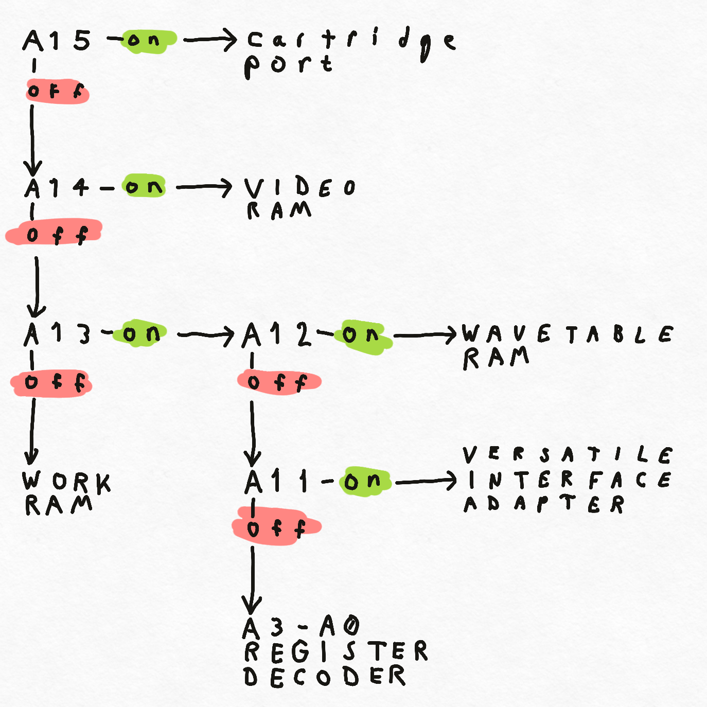 - Pages 48-64 are mapped to the RAM chip hosted on the audio board, which holds the sample data for the wavetable channel.